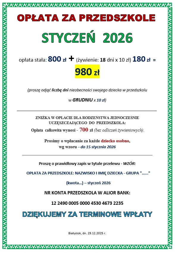 OPŁATA ZA PRZEDSZKOLE - GRUDZIEŃ 2020 -