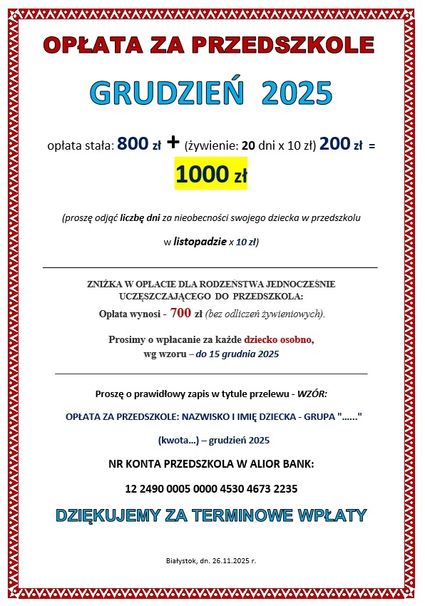 OPŁATA ZA PRZEDSZKOLE - GRUDZIEŃ 2020 -